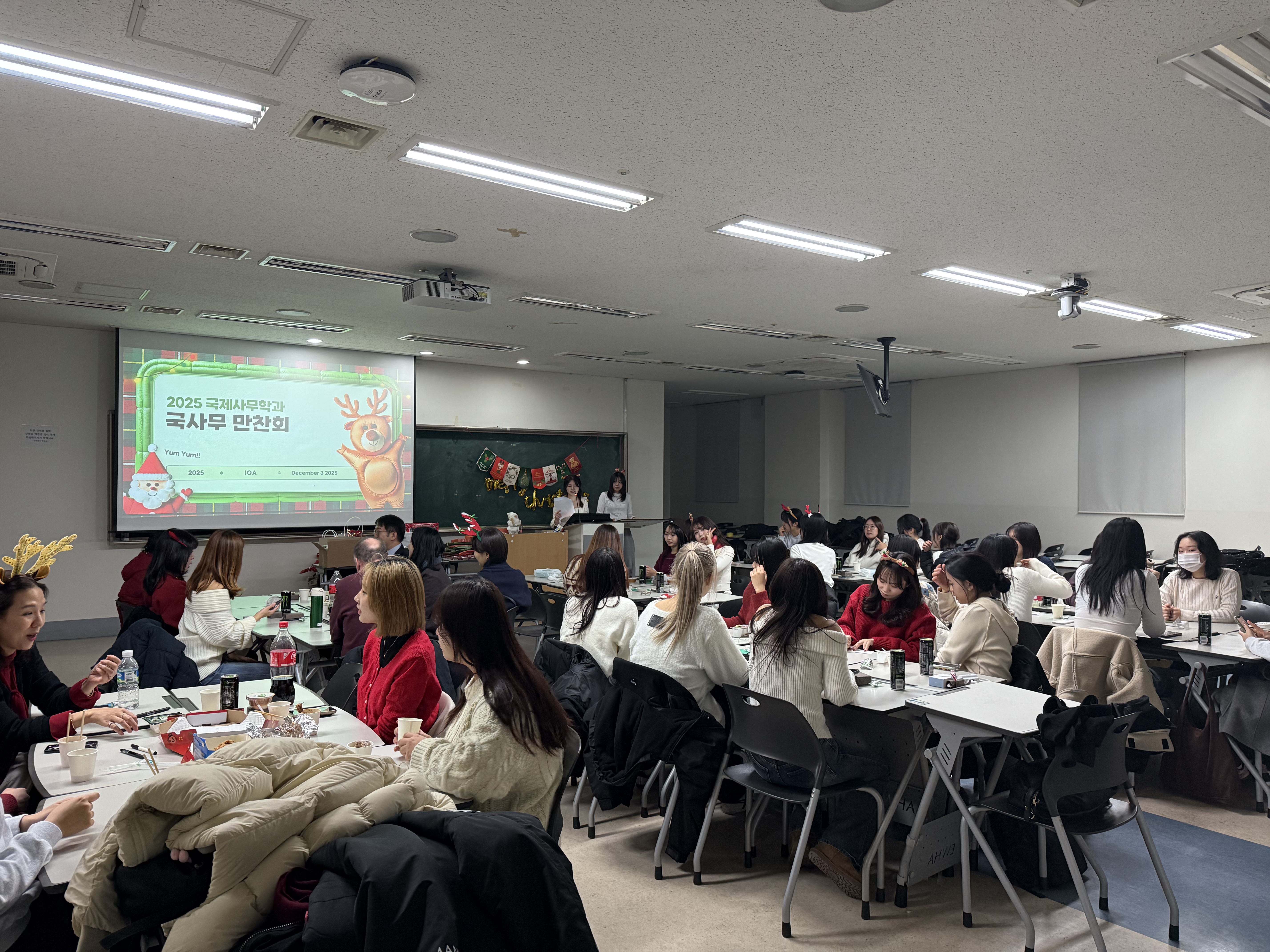 12월 3일에 진행된 국제사무학과 2025 크리스마스 파티가 많은 분들의 참여 속에 무사히 마무리되었습니다. 한 해를 마무리하며 교수님과 학우분들이 함께 모여 즐거운 시간을 보낼 수 있어 더욱 뜻깊은 자리였습니다.
